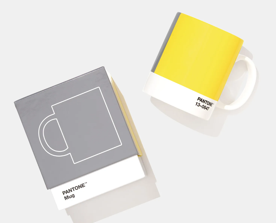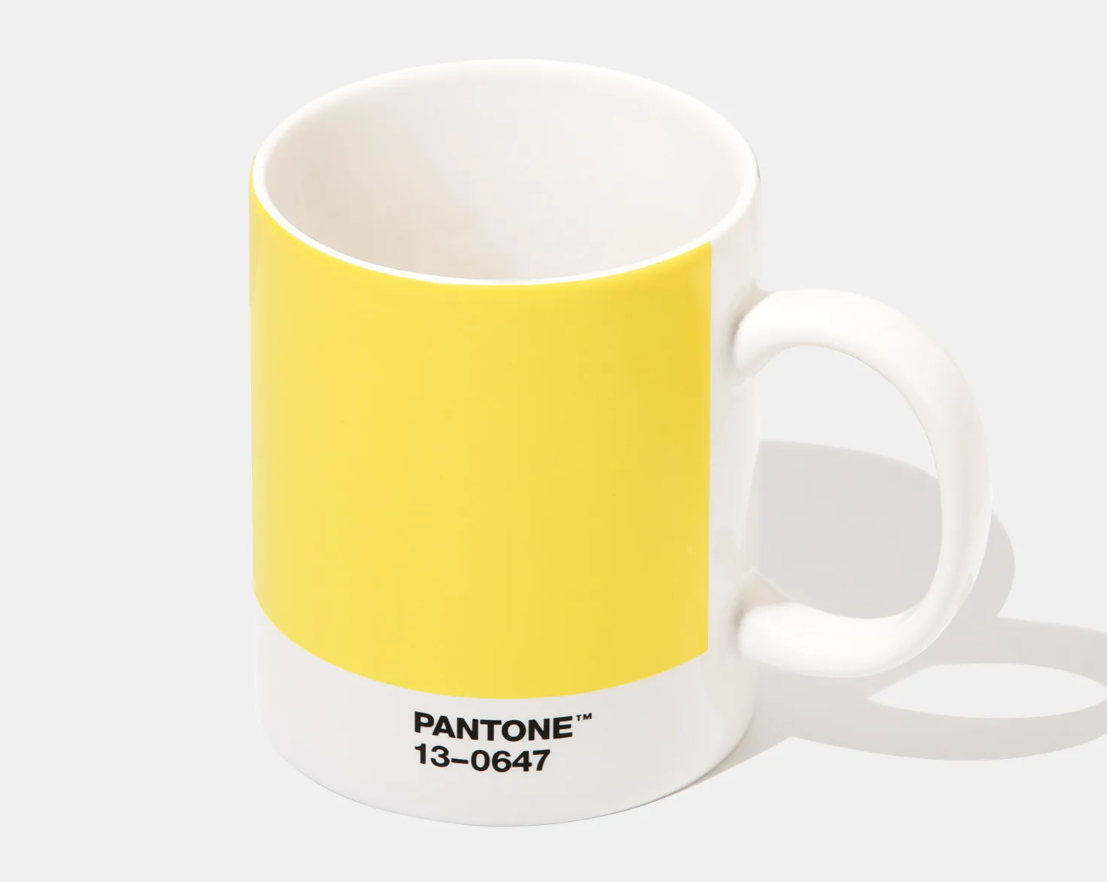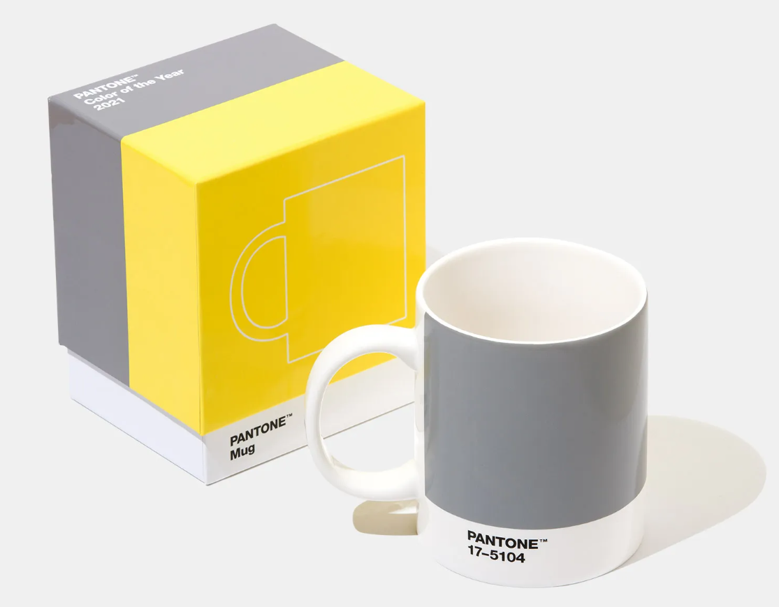 Esta caneca ostenta as cores do ano de 2021 - PANTONE 17-5104 Ultimate Gray + PANTONE 13-0647 Illuminating, numa combinação que pretende transmitir uma mensagem de força subtil e de esperança, num "casamento" de cor que é ao mesmo tempo duradouro e edificante.